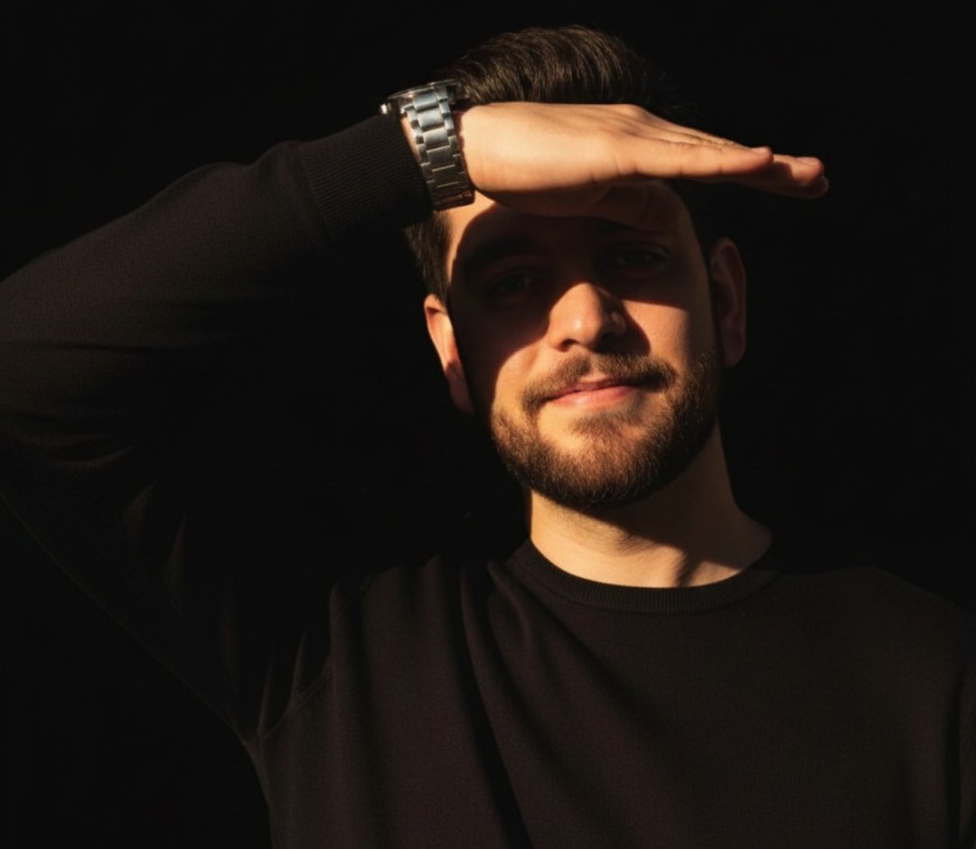 He wears a dark long-sleeve shirt and a metallic wristwatch that glints faintly. A deep black background enhances the dramatic contrast and the warm, subtly muted tones of the light. ***