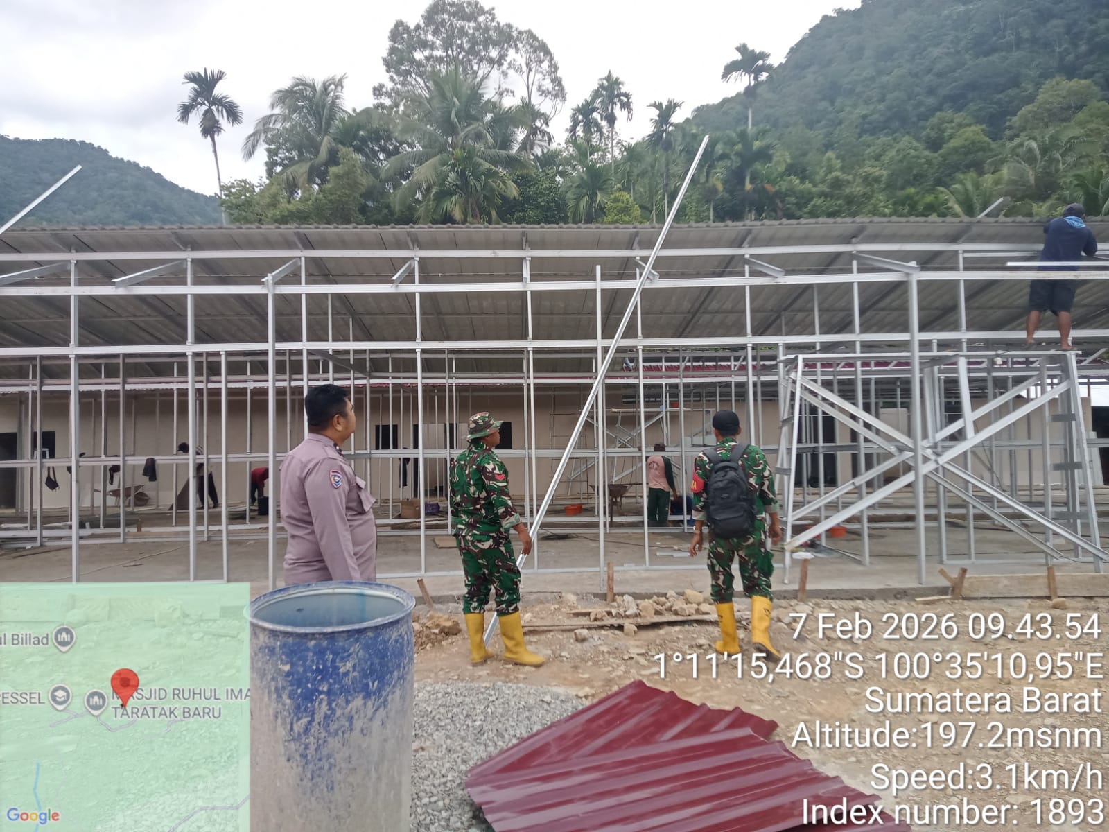 Berdasarkan pantauan pada Senin (9/2), tampak para pekerja sedang menyusun rangka baja ringan untuk huntara. Di sana terdapat deretan huntara yang sudah dipasangi tembok dari papan kayu dan atap seng. Para pekerja juga menyemen lantai.