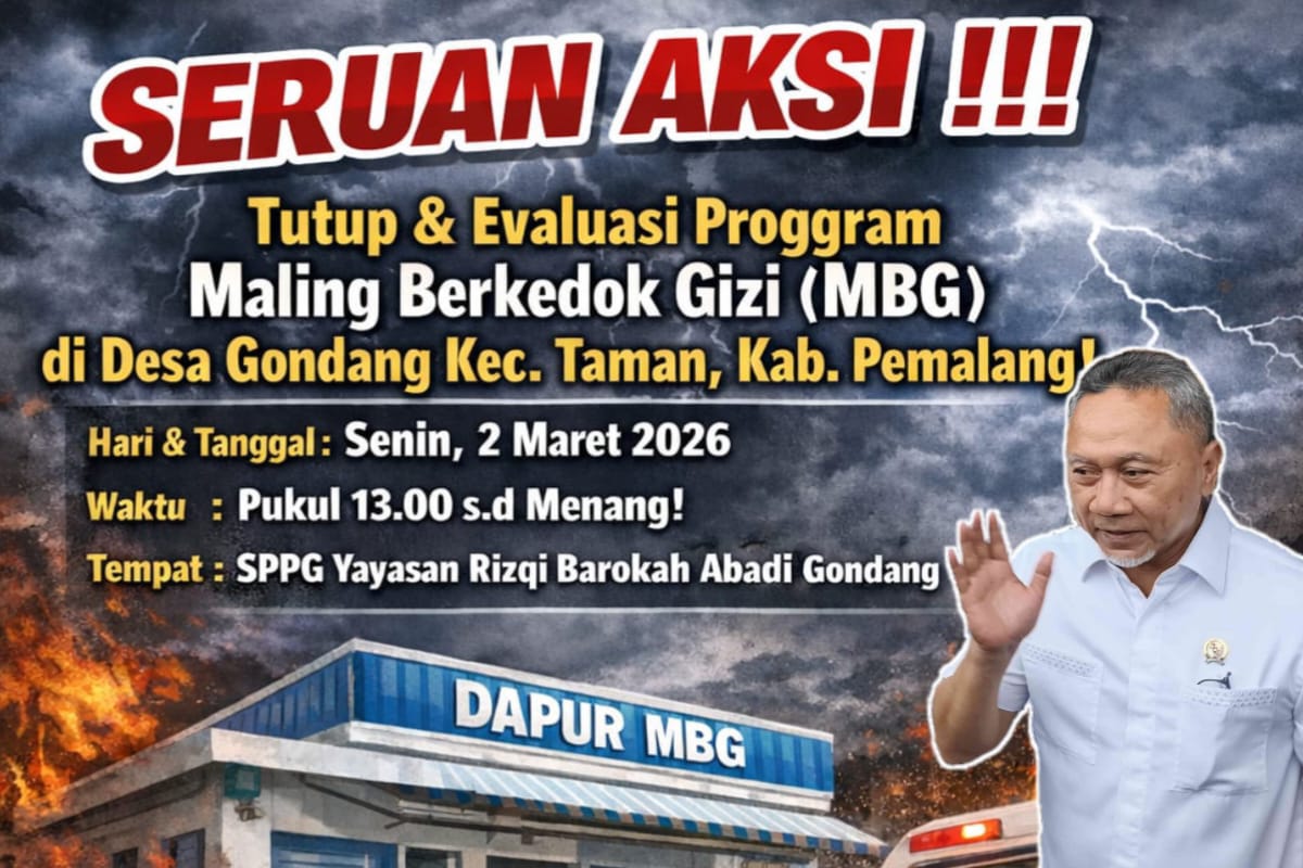 Berdasarkan keterangan yang diperoleh Erapos Online, AMPP bakal menggelar aksi menuntut penutupan dan evaluasi program “Maling Berkedok Gizi (MBG)” di Desa Gondang, Kecamatan Taman, Kabupaten Pemalang