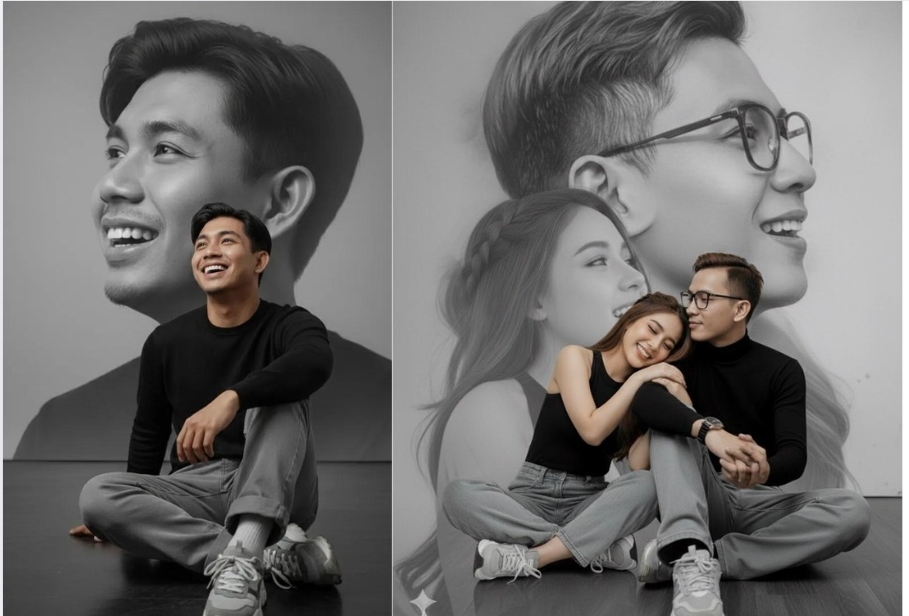 Keunikan dari prompt ini terletak pada komposisi latar belakang yang bernuansa monokrom. Editor diarahkan untuk menambahkan siluet samping (side profile) serta close-up wajah yang sama dari subjek sebagai bingkai artistik yang memperkuat karakter foto studio.